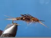 Hook: 2xl Nymph Thread: Brown Tail: Mallard flank (dyed Woodduck) Rib: Gold Wire Gills: Emu/Ostrich Herl Body: Amber Brown Antron Wing Case: Turkey Tail