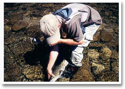 The fishing is exclusively done upstream and you approach the fish from behind, out of its sight. In fast running streams you will often find fish very close to the bank in water so shallow that it hardly covers the dorsal fin.