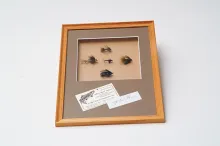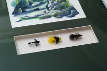 Photos, prints or drawings are an obvious supplement to the flies. They are easy to mount above or next to the fly or flies in a separate opening. A fly and a picture of the fish it caught is a perfect combination. Bas Verschoor's framed stamps and flies is a good example of a series of conceptually connected flies in combination with extra elements - in this case the stamps.