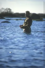 Contrary to what you should think, the fish are not in the deeper parts, but will rest calmly in thigh or knee deep water. So you need to find them, and staying on your feet, constanly moving and poking your fly in all the nice little spots will probably bring you more fish than waiting them out on a spot that seems good to you.