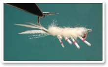 Body: Tufts of tan and white rabbit fur, tied top and bottom along the hook shank. Remember the fly is tied upside down. I.e., white on top, tan underneath.