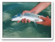 Gradually, ever so gradually the fish came under control, I could clearly see him now, making short powerful runs to the right, then to the left, in water not deep enough to cover his back. 10 metres to go, 5 metres to go, 2 metres to go. I knelt bent the rod and reached for the fish. My first bonefish, the reason I went all that way, a beautiful, streamlined fish with mirror silver sides.