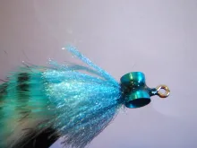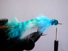 Step 9. Pull the short piece of the rabbit strip over the polar chenille body and tie it down behind the eyes.