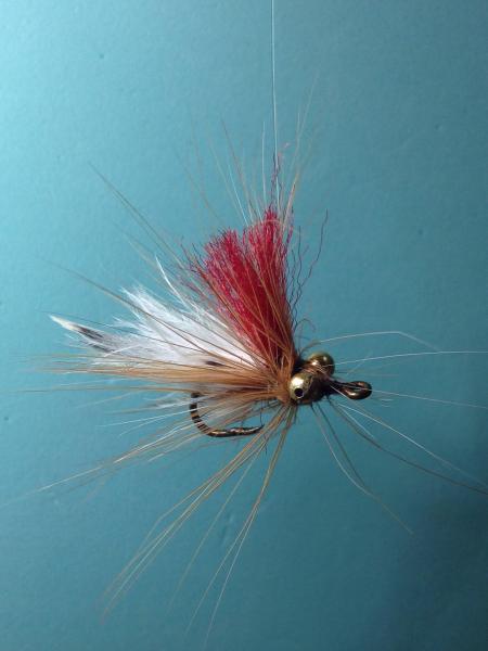 This is my "Queen of Hearts". Taken just after I tied it. It is a wet fly tied on a size 6 bait hook. The Queen was tied on my Nor Vise. This fly looks to be suspended in mid air with out benefit of a fly support or prop.